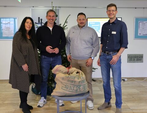 Einen großen, schweren Sack voller Leckereien gab es für die kleinen und jungen Patienten des Hegau-Jugendwerks, um ihnen ihre Reha in der Vorweihnachtszeit zu versüßen. Die süße Spende übergaben nebst einer Geldspende in Höhe von 1000 Euro Dr. Steffen Schabel und Björn Wirth (Bildmitte, v.l.n.r.), die beiden Geschäftsführer des Singener Unternehmens WiMedical, an Dr. Thomas Göhringer, Geschäftsführer des Fördervereins HegauHelden (re außen), und an Ute Schröder, Schriftführerin des Fördervereins.
